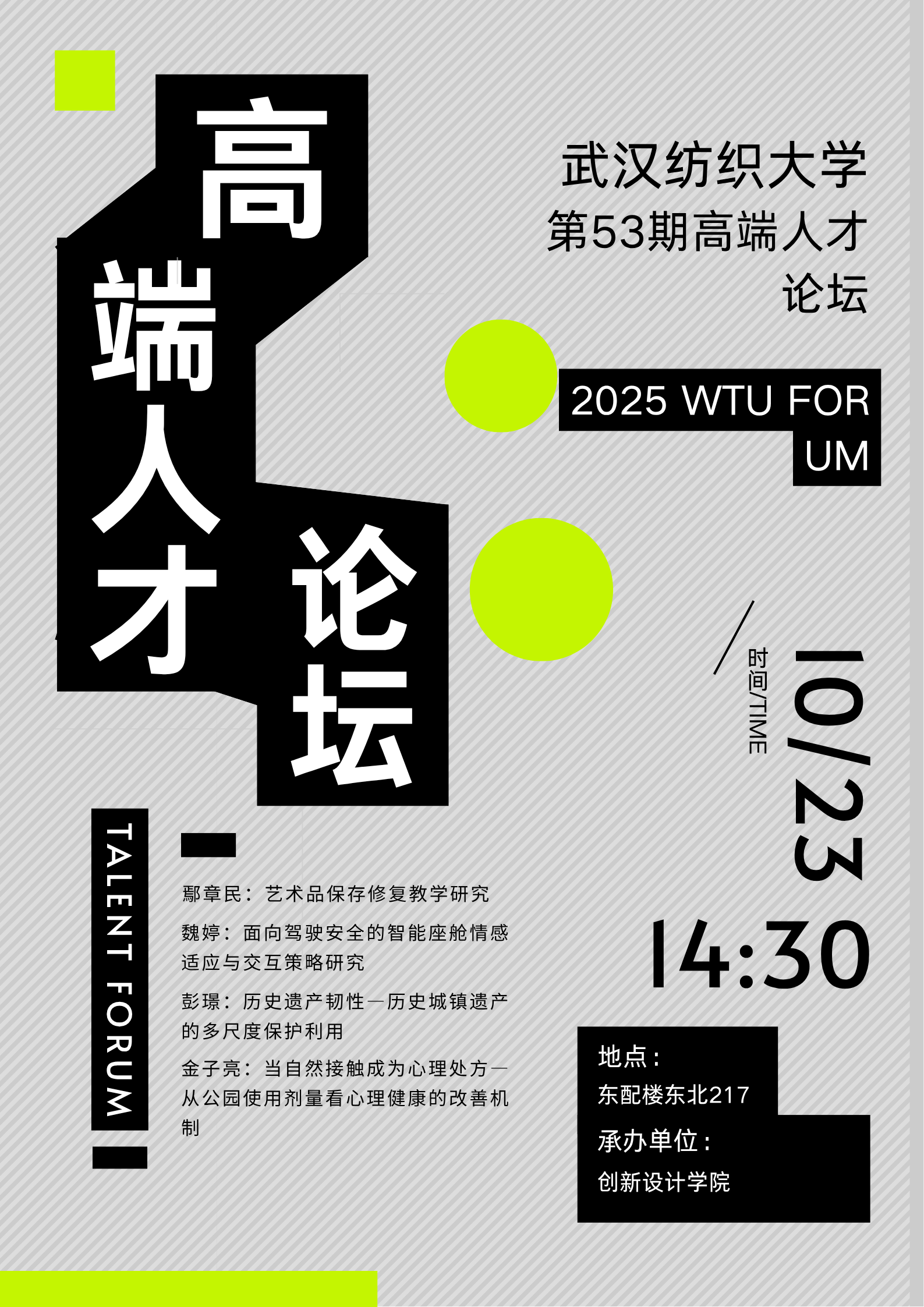本期论坛围绕多个前沿学术话题展开。鄢章民老师分享了关于“艺术品保存修复教学研究”的精彩内容,深入剖析了艺术品保存与修复领域的教学现状与未来发展方向,为相关教学与实践提供了新的思路;魏婷博士带来了“面向驾驶安全的智能座舱情感适应与交互策略研究”的主题报告。她详细阐述了智能座舱在保障驾驶安全方面如何通过情感适应与交互策略实现创新,展示了该领域的前沿研究成果;彭璟博士则聚焦“历史遗产韧性—历史城镇遗产的多尺度保护利用”,从多角度探讨了历史城镇遗产的保护与利用策略,强调了保护历史遗产的重要性与紧迫性;金子亮博士以“当自然接触成为心理处方—从公园使用剂量看心理健康的改善机制”为题,通过大量研究数据和案例,揭示了自然接触对心理健康的积极影响及其内在机制。