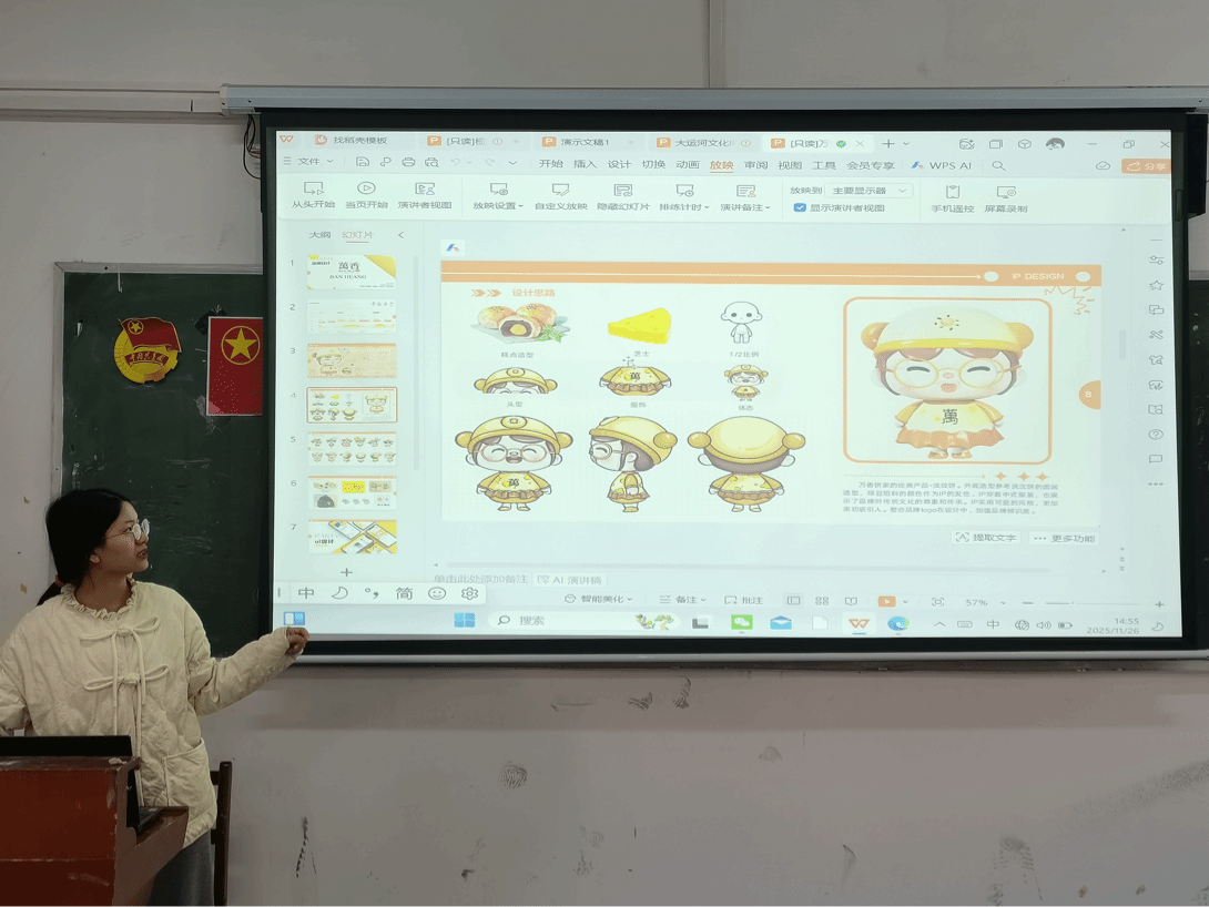 宋嫣嫣同学聚焦品牌设计领域,汇报主题为《榄菊品牌形象设计》。她的设计并非单一的视觉创作,而是构建了一套完整的品牌视觉体系,包括辨识度极强的logo设计、贴合产品特性的包装设计、富有亲和力的IP形象设计,以及涵盖名片、信封、工作证等的全套办公系统设计。整个设计围绕“品牌年轻化”展开,通过明快的色彩搭配、简约的线条语言,打破了榄菊的传统品牌印象,让经典品牌与年轻消费群体的审美需求产生共振,为品牌注入新的市场活力。