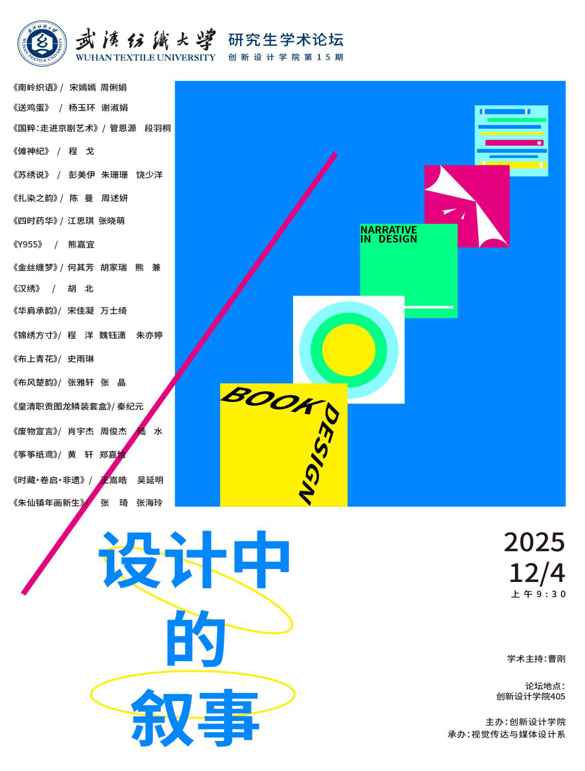 为了进一步促进学院的科研工作,加强师生间的学术交流,提高研究生素质和学术氛围。12月4日,76net必赢官网创新设计学院第15期研究生学术论坛在南湖校区创新设计学院学术报告厅405举行。此次论坛主题为“设计中的叙事”, 由创新设计学院主办,视觉传达与媒体设计系承办,视传曹刚老师主持,学院视觉传达专业学生参加了论坛。
