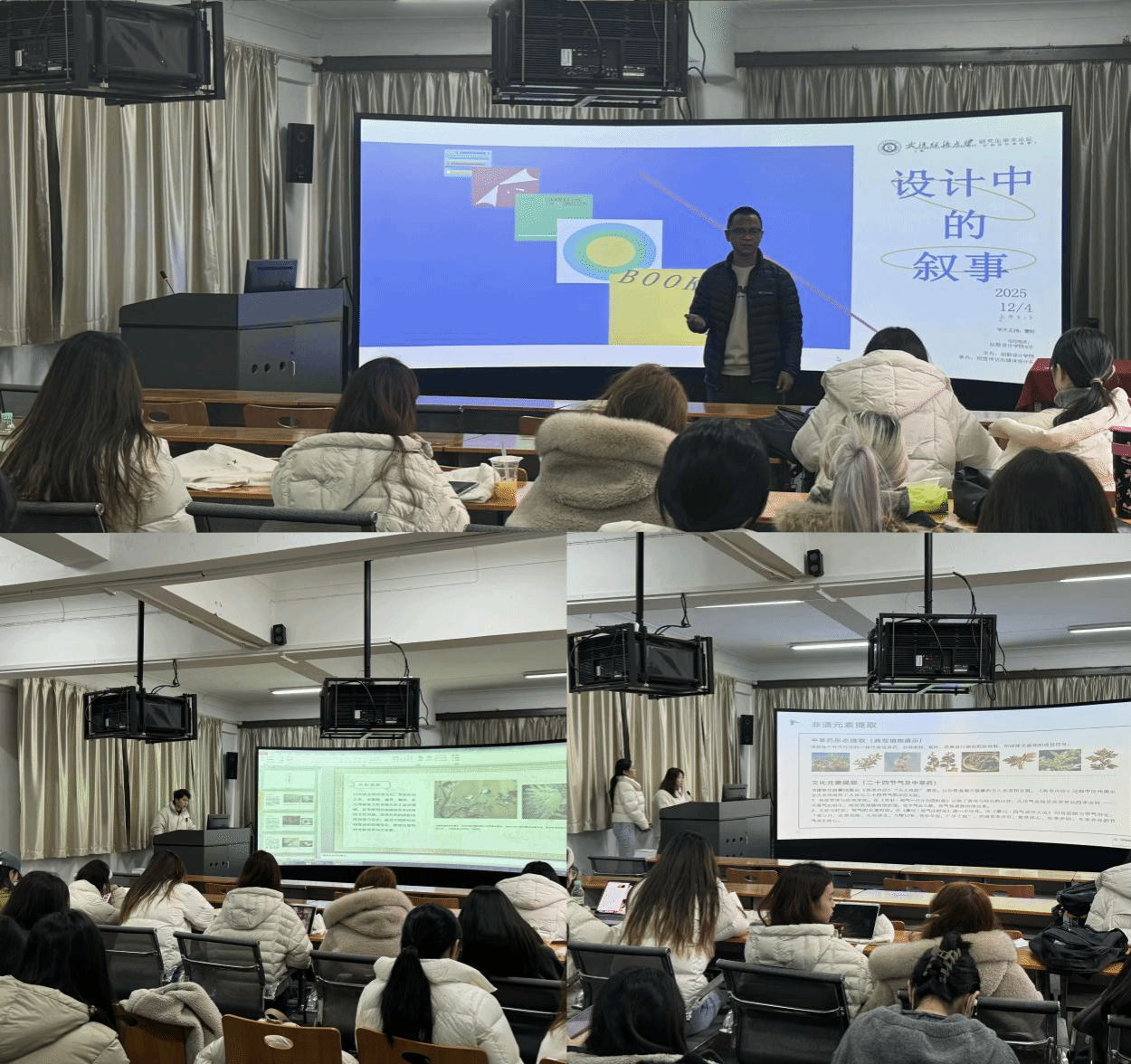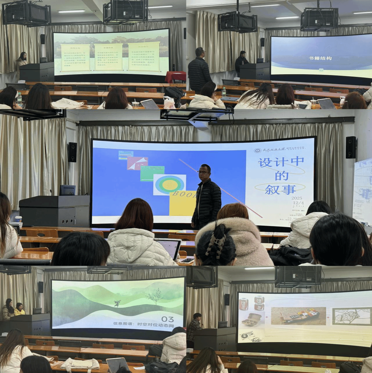 论坛现场,同学们以非遗的“叙事”为线索,分享了如何通过信息图表可视化和书籍设计,将古老的故事转化为可感知、可传播的视觉语言。曹老师全程专注聆听,不仅热情肯定了同学们展现出的创新思维与积极探索的精神,更针对每一份作品,从叙事逻辑、视觉呈现到文化表达等多个维度,提出了细致而富有启发性的改进建议。