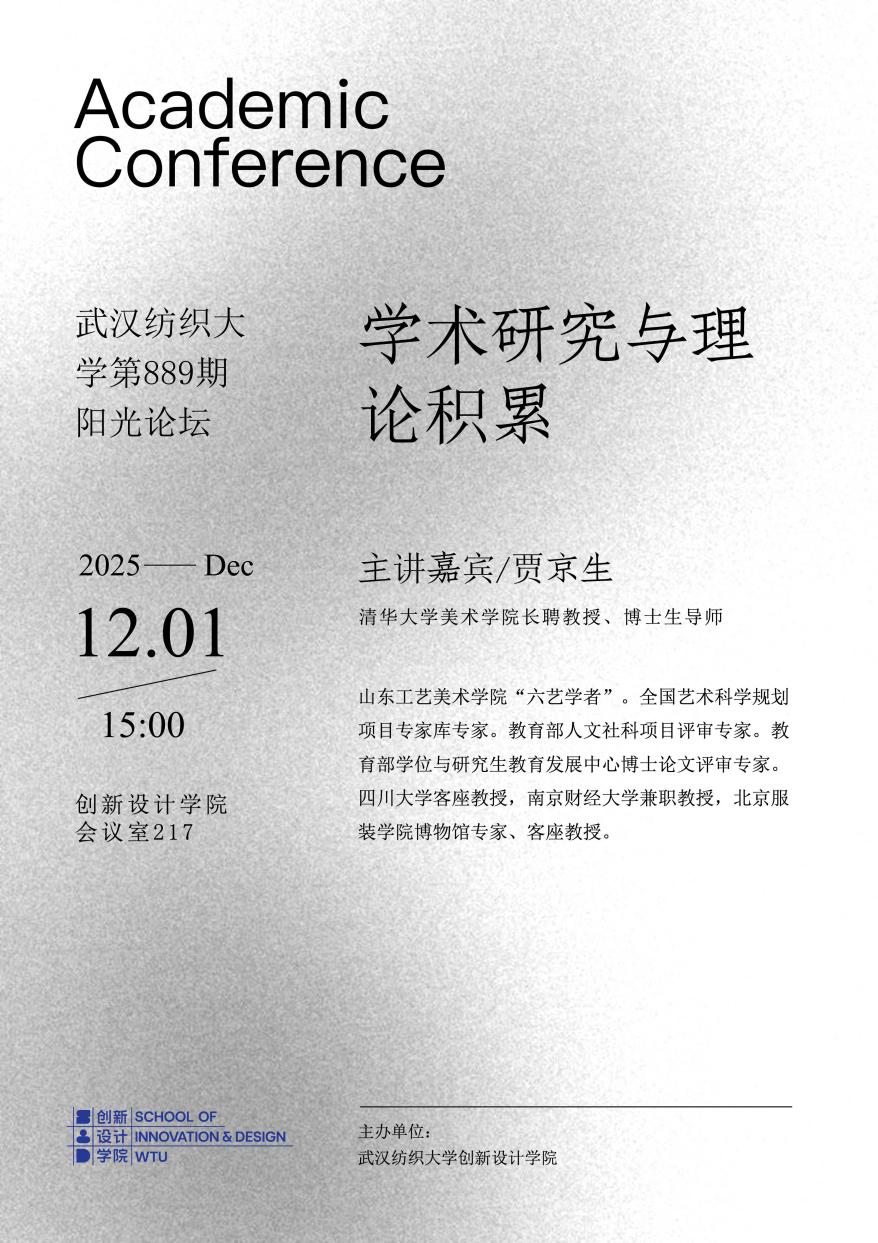 2025年12月1日下午2点,76net必赢官网创新设计学院在学院会议室217成功举办第889期阳光论坛。本次论坛以“学术研究与理论积累”为主题,特邀清华大学美术学院长聘教授、博士生导师贾京生担任主讲嘉宾,由刘凡院长主持。活动主要面向学院教师,旨在提升教师在国家级科研项目申报方面的能力与经验。