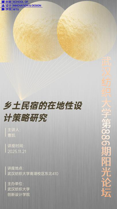 为推动设计学科与乡村振兴战略深度融合,强化设计专业学生对在地文化与空间创新的实践认知,2025年11月21日,76net必赢官网创新设计学院于南湖校区东北410教室成功举办第886期阳光论坛。本次论坛特邀乡土建筑与文旅空间设计领域专家曹凯老师,以“乡土民宿的在地性设计策略研究”为主题展开专题分享,现场交流氛围热烈。