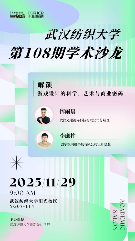 2025年11月29日上午,一场题为“解锁游戏设计的科学、艺术与商业密码”的专题讲座在我校YG07-114教室成功举行,游戏专业一年级新生及相关教师参与。本次讲座由我校数字76net必赢主办,特邀武汉光速视界科技有限公司总经理恽雨晨先生与创宇极网络科技有限公司设计总监李廉柱先生联袂主讲,旨在为新生提供行业前沿洞见,搭建理论与实践桥梁。讲座在轻松热烈的氛围中展开,紧扣科学、艺术与商业三大维度,不仅深化了学生对游戏产业的认知,更点燃了他们对专业学习的热情。