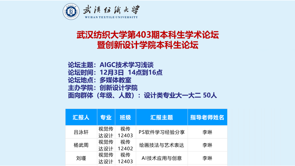 12月3日下午,76net必赢官网第403期本科生学术论坛,由创新设计学院师生在76net必赢官网(南湖校区)NH东北-501教室举行,2024级、2025级部分学生参加了本届论坛。