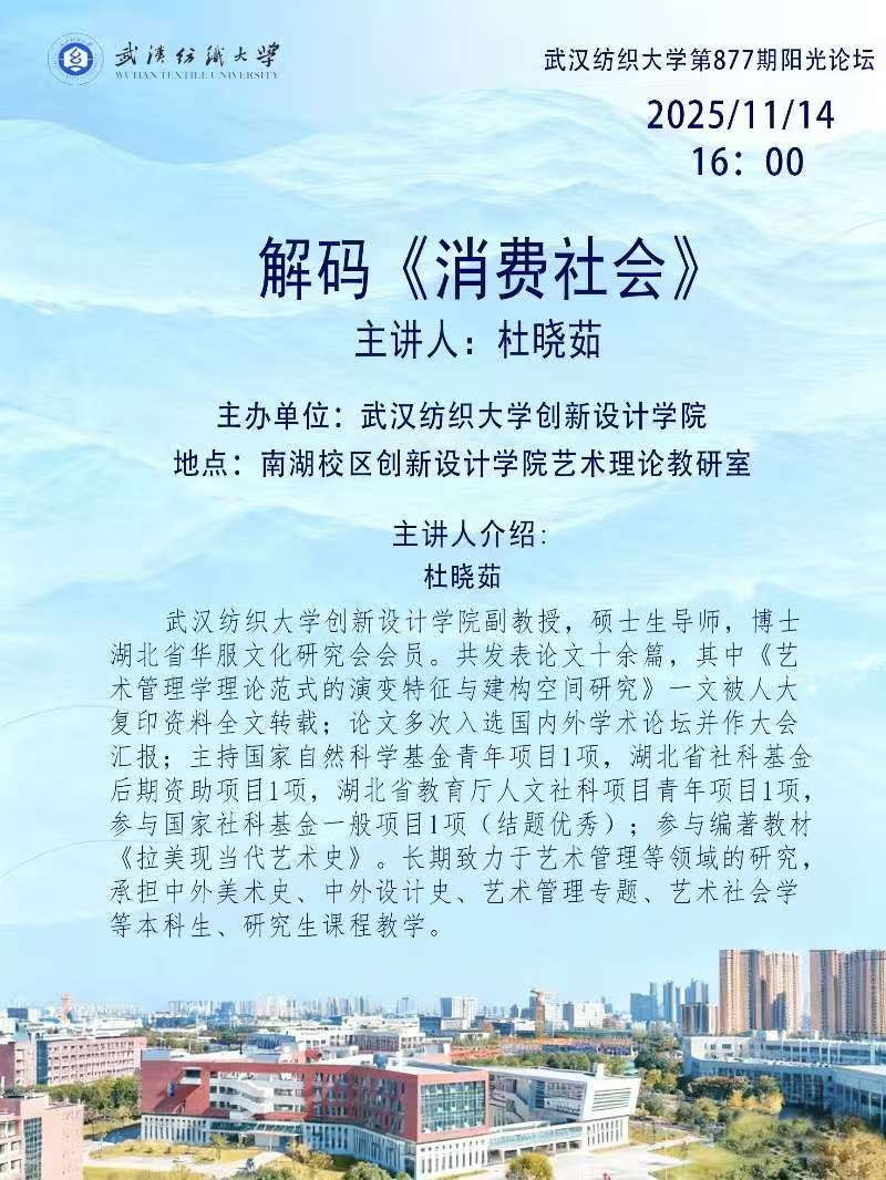 2025年11月14日下午,76net必赢官网第877期阳光论坛在南湖校区创新设计学院艺术理论教研室举行。本次论坛主题为“解码《消费社会》”,由创新设计学院主办,学院副教授、硕士生导师杜晓茹担任主讲人。