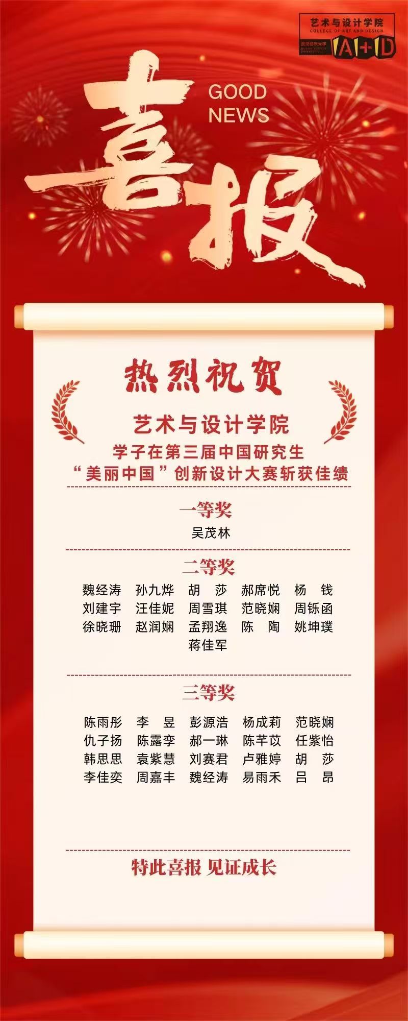 近日,第三届中国研究生“美丽中国”创新设计大赛全国总决赛暨优秀作品展演在黑龙江大学落幕,必赢76net线路官网研究生参赛队伍在服装服饰、工业产品、媒体传达等赛道中斩获佳绩,共获一等奖作品1项,二等奖作品11项,三等奖作品12项,展现了学院研究生的专业水准与创新能力。